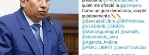 Mensaje salió de su Twitter oficial al término de reunión en Palacio de gobierno con PL. Estaba copiado a diversos medios de comunicación