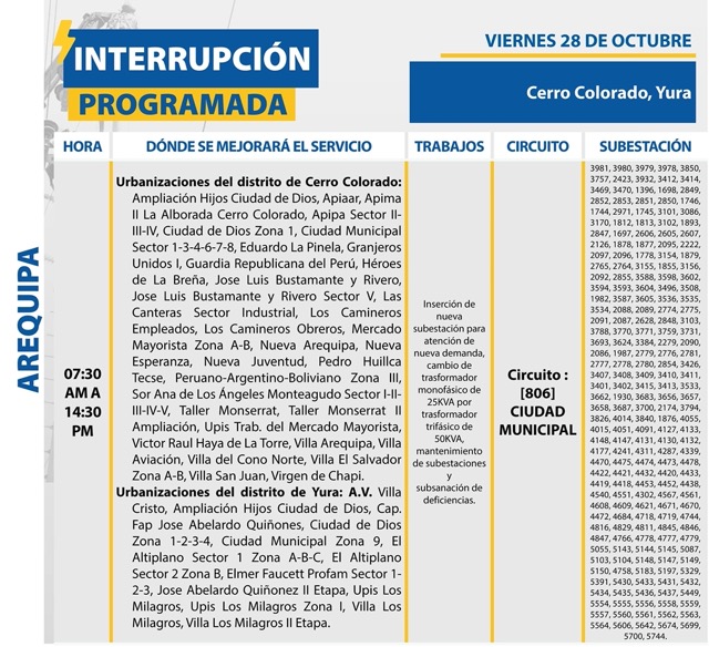 Se anunció el corte programado en ubicaciones de Cerro Colorado, Yura, Polobaya y Cocachacra verán interrumpido el suministro eléctrico el viernes 28.