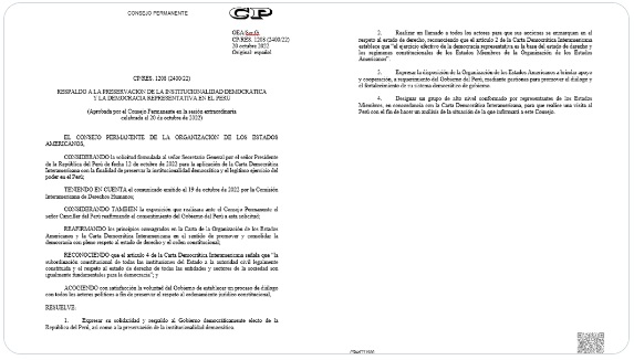 Luego, el Consejo Permanente de la OEA aprobó por aclamación una resolución que aprueba enviar una misión para estudiar la situación democrático en Perú. De acuerdo a la resolución propuesta por la Representación Permanente del Perú ante la OEA, a cargo de Harold Forsyth, el Consejo Permanente expresó su “solidaridad y respaldo al Gobierno democráticamente electo” de Pedro Castillo.