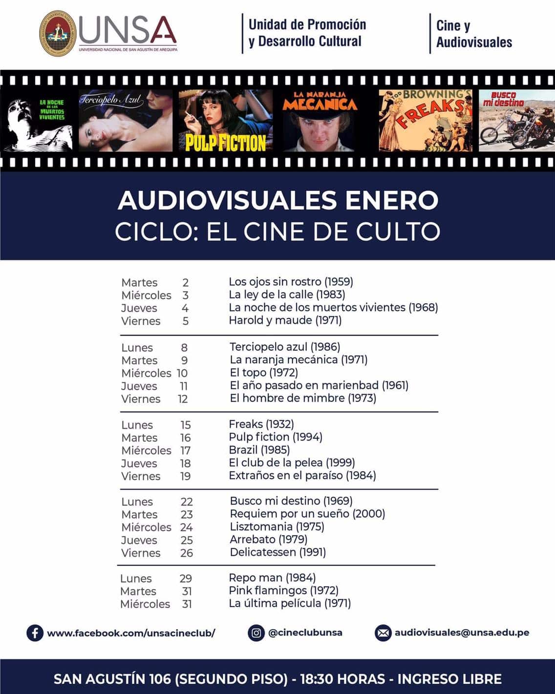 El cineclub de la UNSA trae una cartelera de culto para todo enero. Entre las películas que proyectará están Terciopelo azul, La naranja mecánica, Pulp Fiction, El club de la pelea, Requiem por un sueño, Delicatessen, Pink Flamingos y más filmes iconos de la cultura pop.
