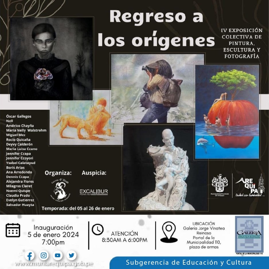 Hasta el 26 de enero, en la Galería Vinatea Reynoso en el portal de la Municipalidad, la subgerencia de Educación y Cultura, presenta la exposición colectiva «Regreso a los Orígenes».