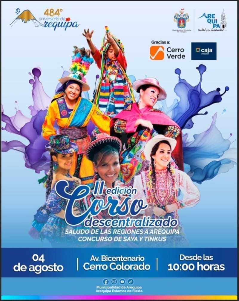 La Ciudad Blanca celebra su 484 aniversario de fundación española con el Corso Descentralizado Saludo de las regiones a Arequipa, que se realizará en el Cono Norte. Este año, el evento se llevará a cabo en la Vía Bicentenario del distrito de Cerro Colorado, tras la coordinación entre la alcaldesa Gina García y el alcalde de Arequipa, Víctor Hugo Rivera.