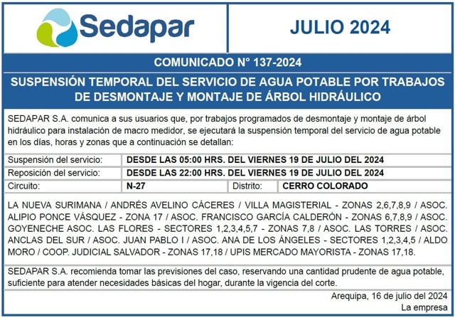 Conocedores de los inconvenientes que los cortes de agua generan en la población de Arequipa, Sedapar instó a los ciudadanos en zonas comprendidas a tomar precauciones. Es decir, reserven el recurso hídrico en cantidad prudente, para cubrir sus necesidades básicas durante la vigencia de la interrupción. La EPS explicó que la reposición del servicio, a partir de la hora estipulada, queda garantizada.