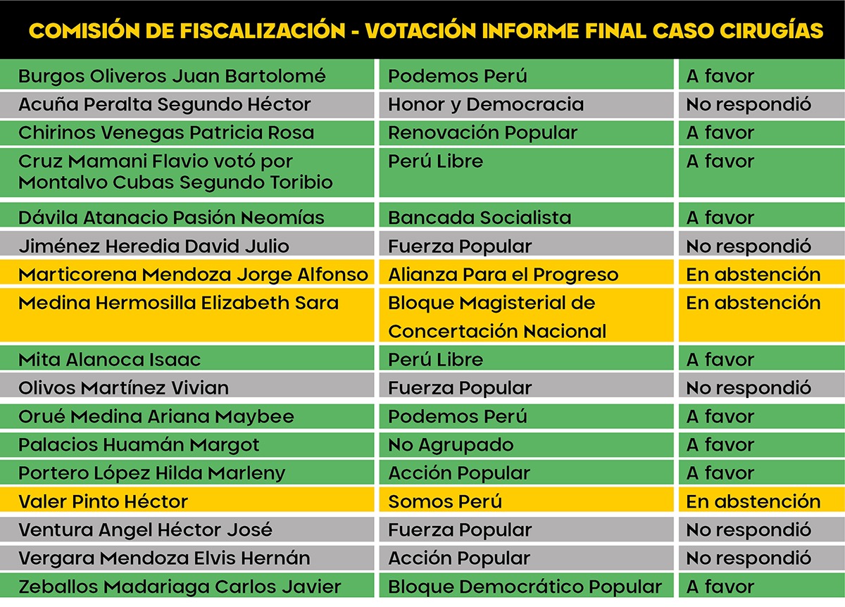 Con nueve votos a favor y tres abstenciones se aprobó el informe que deberá pasar al Pleno del Congreso. Los congresistas de Fuerza Popular no se hicieron presentes en la sesión ni votaron, al igual que los parlamentarios de Honor y Democracia y Acción Popular. Tres parlamentarios estaban de licencia.