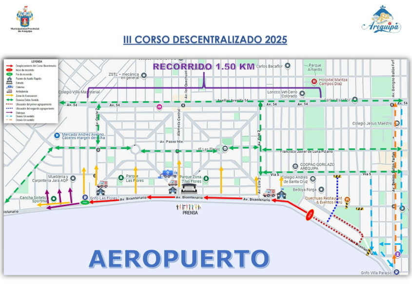 Mañana, domingo 10 de agosto, se desplegará el Corso Descentralizado y el Concurso de Sayas y Caporales, con motivo del aniversario de Arequipa. Este pasacalle partirá desde la intersección de la Av. Bicentenario con Av. Benigno Ballón Farfán, continuará por toda esta vía y culminará a la altura del Grifo Las Flores, en un recorrido continuo y lleno de animación para el público. Esto para que tengan en cuenta también los conductores y transeúntes con viajes agendados en el aeropuerto de la Ciudad Blanca.