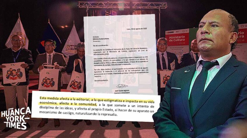 Francisco Curichaoa Vilchez, director del Instituto de la Juventud y Cultura y coorganizador de la feria, señaló que la exclusión de Achawata fue decisión de la DDC-Junín. “Los filtros los pasó la DDC”, dijo a Huanca York Times sobre el retiro de la editorial, que ya había instalado sus libros en los stands. Más temprano en entrevista con Exitosa Huancayo, añadió: “La supervisión y revisión de las editoriales es de la Dirección Desconcentrada de Cultura de Junín”.