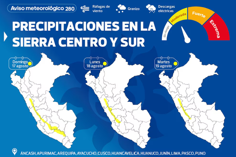 Hasta el 19 de agosto, la DANA “Oriana” afectará las zonas alto andinas de 11 regiones. Se espera posibles lluvias, granizo, nieve y temperaturas extremas en ciertas partes de la sierra de Perú. En Patahuasi, Arequipa, se registraron temperaturas de hasta -12°C.