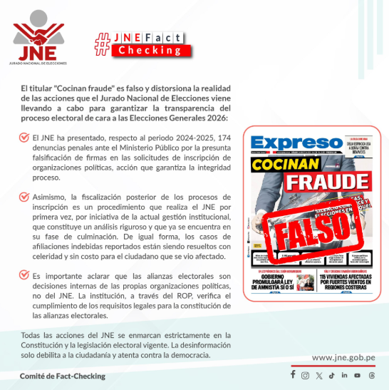En respuesta a cuestionamientos sobre la transparencia del proceso electoral, el Jurado Nacional de Elecciones (JNE) emitió un comunicado en el que desmiente categóricamente las versiones que señalan “cocinan fraude” en las Elecciones 2026. Esto en relación con una portada del diario Expreso.