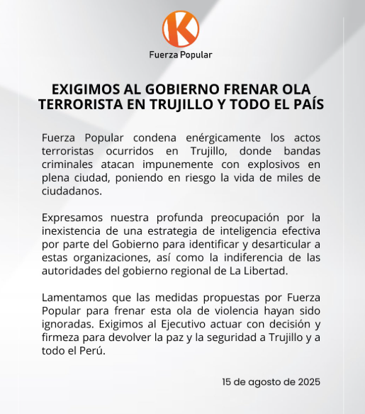 Fuerza Popular exige mano dura tras atentado en Trujillo pese a historial de leyes que favorecen a la impunidad respaldas por sus congresistas. Tras la explosión ocurrida el jueves 14 de agosto en la cuadra 8 de la avenida Perú, que dejó cinco heridos y más de veinte viviendas afectadas, el partido Fuerza Popular emitió un comunicado exigiendo al gobierno de Dina Boluarte acciones contra la criminalidad organizada, llamándola “ola terrorista”.