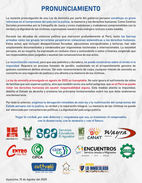 Diversos centros sociales vinculados a la Compañía de Jesús expresaron su enérgico rechazo a la reciente Ley de Amnistía promulgada en agosto de 2025 por el gobierno peruano, al considerarla un grave retroceso en materia de justicia, memoria y derechos humanos.