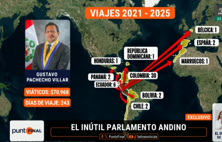 Cada parlamentario andino recibe 15,600 soles mensuales, seguridad del Estado y acceso a viáticos internacionales. Sin embargo, se han despachado al extranjero, con destinos entre los que figuran España, Marruecos, Bélgica, República Dominicana y Honduras, con estadías en hoteles cinco estrellas y restaurantes exclusivos. Gustavo Pacheco lidera la lista con 45 viajes por más de 70 mil dólares.