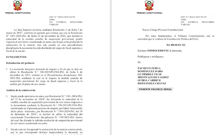 El TC rechazó la demanda por sustracción de la materia, una figura jurídica que se aplica cuando el acto cuestionado ya no tiene efectos legales vigentes. En este caso, la medida cautelar de suspensión caducó en noviembre de 2024, sin que se resolviera el recurso de reconsideración que Patricia Benavides había interpuesto.