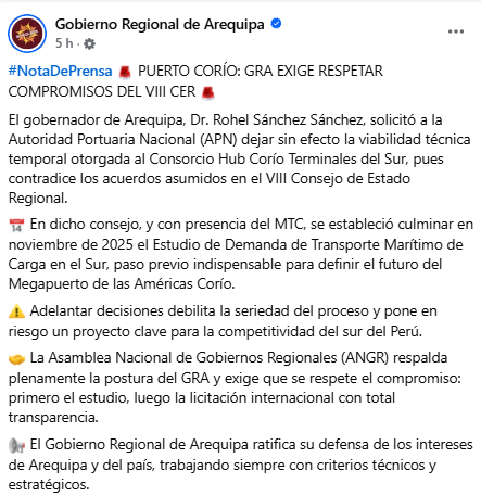 Según el Gobierno Regional de Arequipa (GRA), la decisión de la Autoridad Portuaria, adscrita al MTC, contradice los acuerdos asumidos en el VIII Consejo de Estado Regional, donde se estableció —con presencia del Ministerio de Transportes y Comunicaciones— que el Estudio de Demanda de Transporte Marítimo de Carga en el Sur debía culminarse en noviembre de 2025 antes de avanzar con cualquier licitación. “Adelantar decisiones debilita la seriedad del proceso y pone en riesgo un proyecto clave para la competitividad del sur del Perú”, señala el comunicado oficial del GRA.