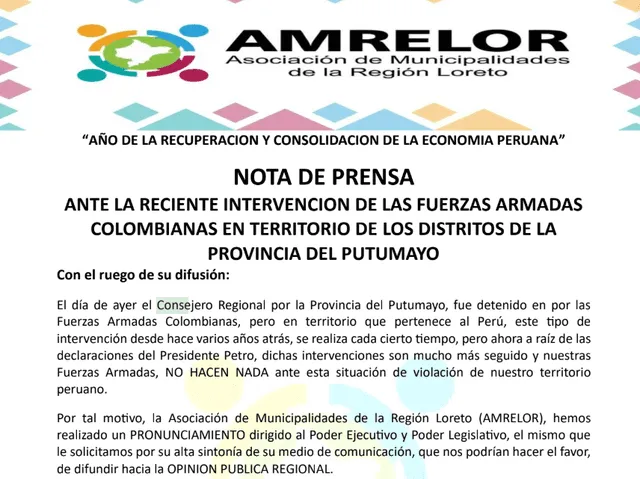 Por ello, los alcaldes de la región Loreto han alzado su voz de protesta frente a lo que denominan, “abandono del Estado en las zonas limítrofes con Colombia” y además denunciaron que es recurrente ver a las Fuerzas Armadas colombianas y de grupos armados vinculados a las FARC en los ríos de la provincia del Putumayo.