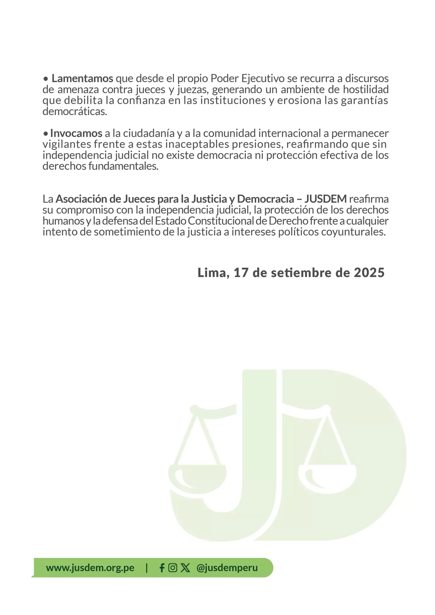 Instaron a que los procesos judiciales se desarrollen sin interferencias e invocaron “a la ciudadanía y a la comunidad internacional a permanecer vigilantes frente a estas inaceptables presiones, reafirmando que sin independencia judicial no existe democracia ni protección efectiva de los derechos fundamentales”.