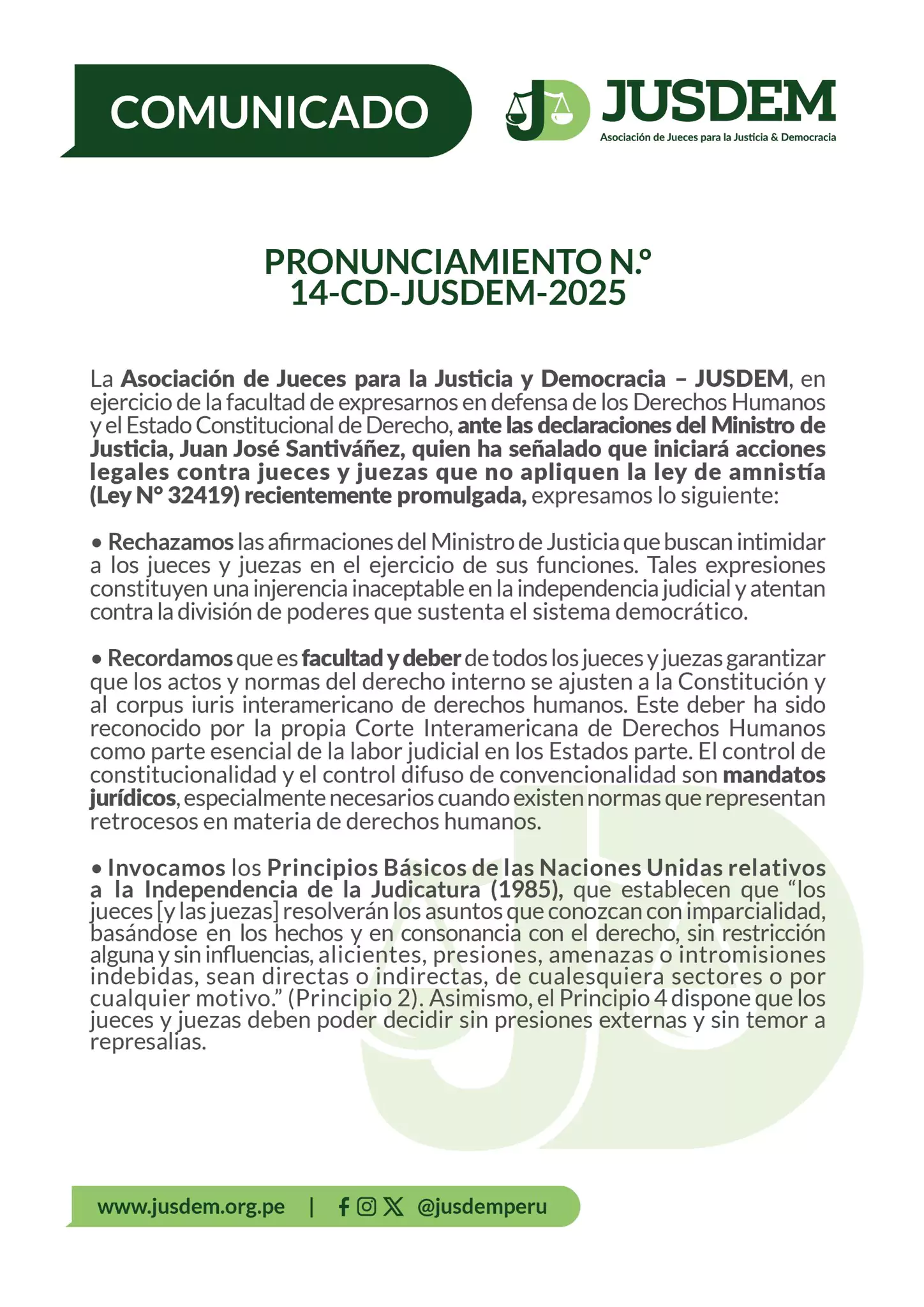 La Asociación de Jueces para la Justicia y Democracia (Jusdem) a través de un comunicado manifestó que las declaraciones del ministro de Justicia, Juan José Santiváñez, son una “injerencia inaceptable” en su independencia.