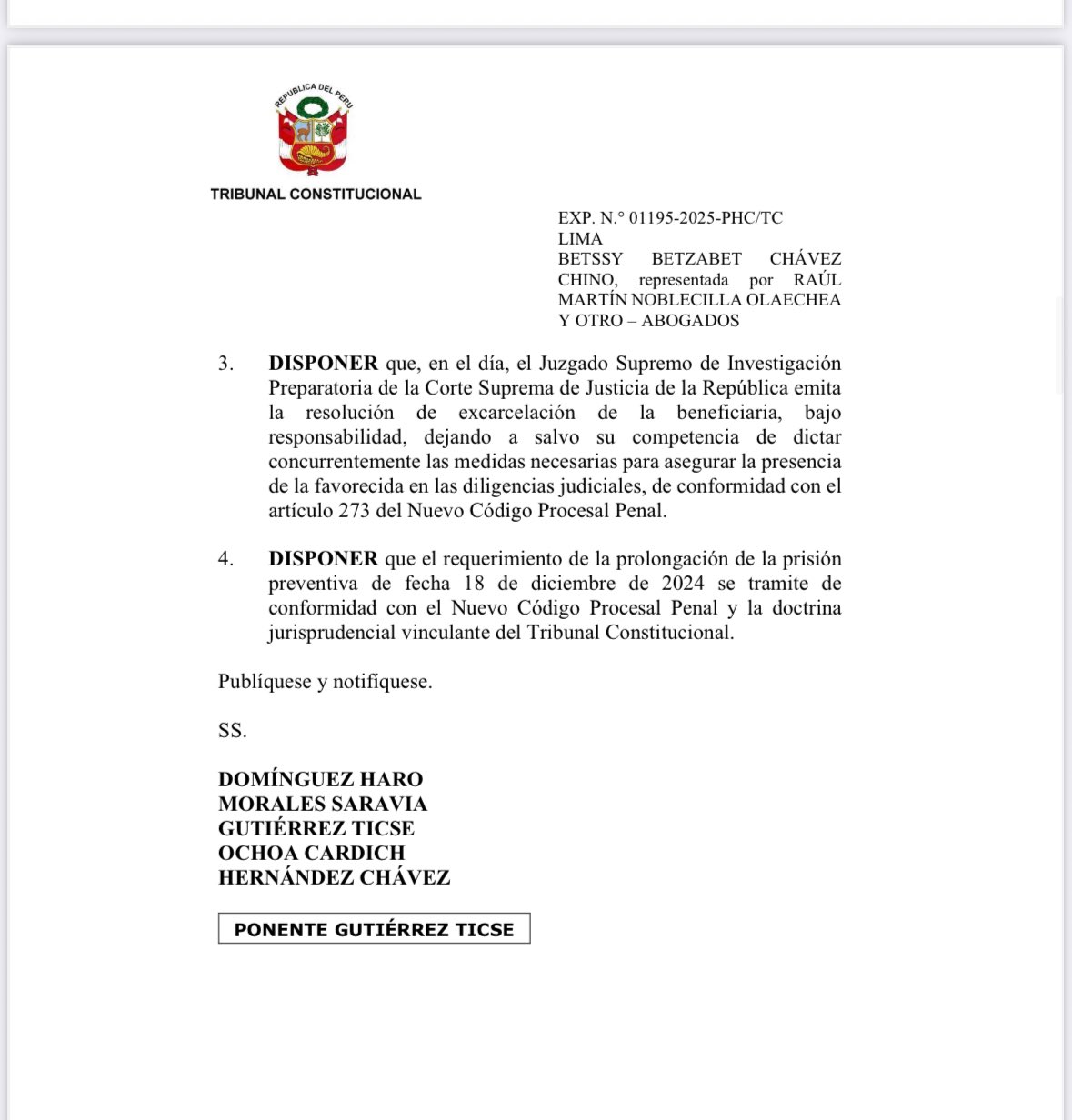 De esta forma, el Tribunal Constitucional, ordena la excarcelación de la extitular de la Presidencia del Consejo de Ministros, Betssy Chávez, al declarar fundado el recurso de agravio constitucional interpuesto por su defensa.