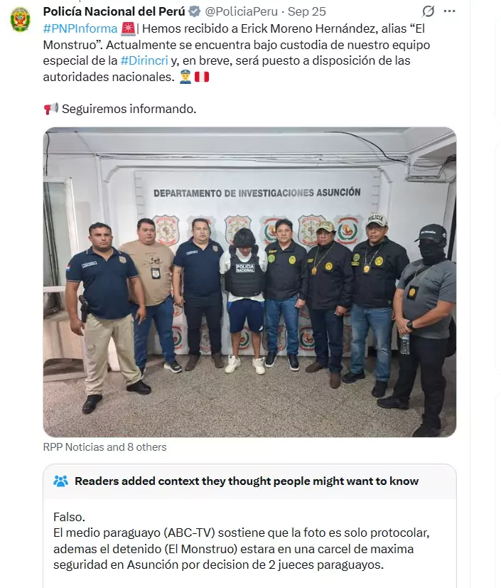 Además, mediante un mensaje en la red oficial de la Policía Nacional del Perú, del jueves 25, informaban: “Hemos recibido a Erick Moreno Hernández, alias “El Monstruo”. Actualmente, se encuentra bajo custodia de nuestro equipo especial de la #Dirincri y, en breve, se le pondrá a disposición de las autoridades nacionales”. Sin embargo, esto se desmintió, ya que todavía siguen las gestiones dentro del sistema policial y judicial de Paraguay.