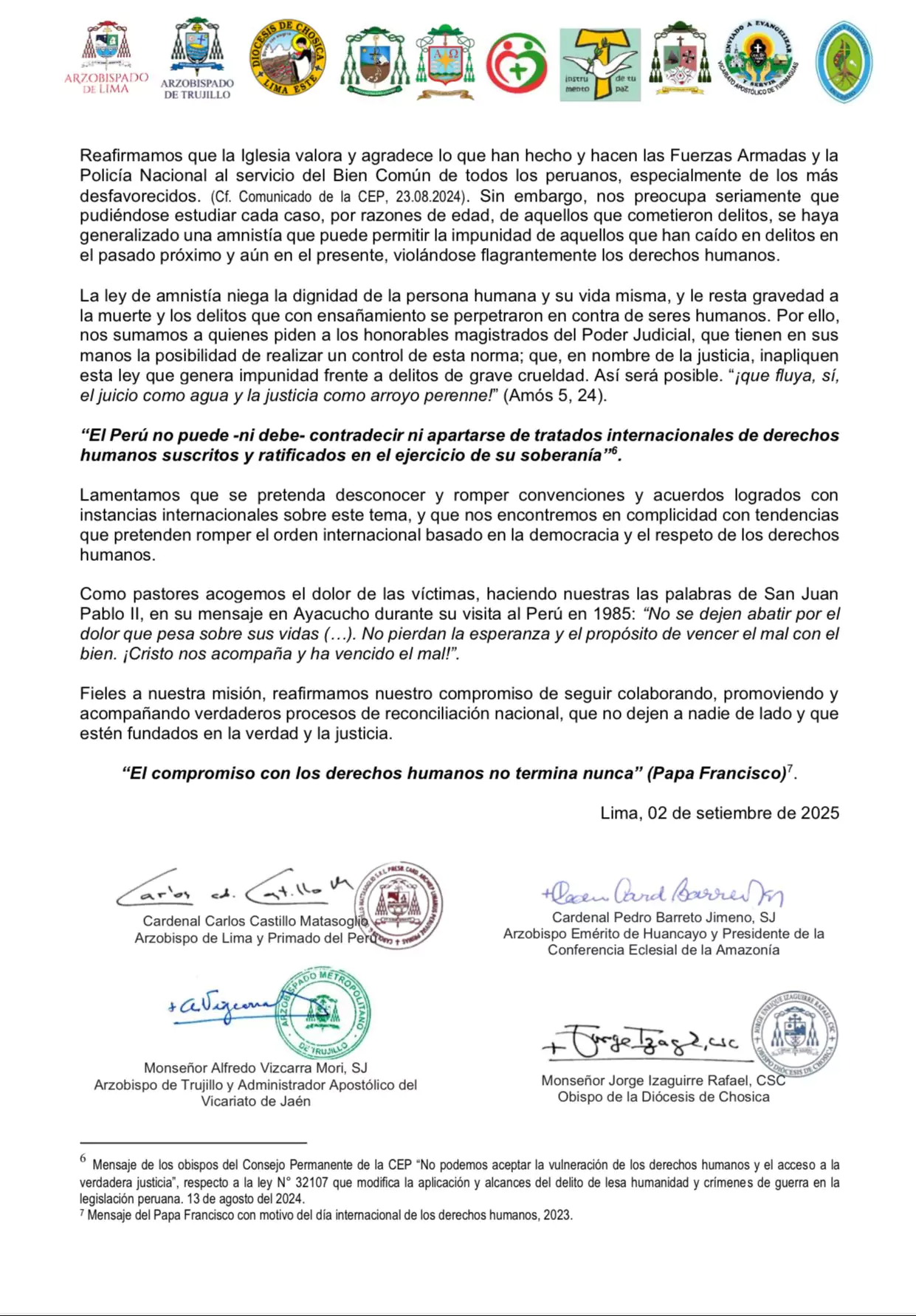 Como se informó, el presidente del Consejo Permanente de la Conferencia Episcopal Peruana, monseñor Miguel Cabrejos, ya se había pronunciado antes advirtiendo que esta disposición constituye un retroceso en la defensa de los derechos fundamentales. «No podemos aceptar la vulneración de los derechos humanos ni el acceso a la verdadera justicia», dijo días previos.