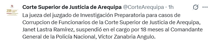 Fue la jueza del 6to juzgado de Investigación Preparatoria para casos de Corrupción de Funcionarios de la Corte Superior de Justicia de Arequipa, Janet Lastra Ramírez, quien dispuso la suspensión por 18 meses del Comandante General de la PNP Zanabria Angulo.