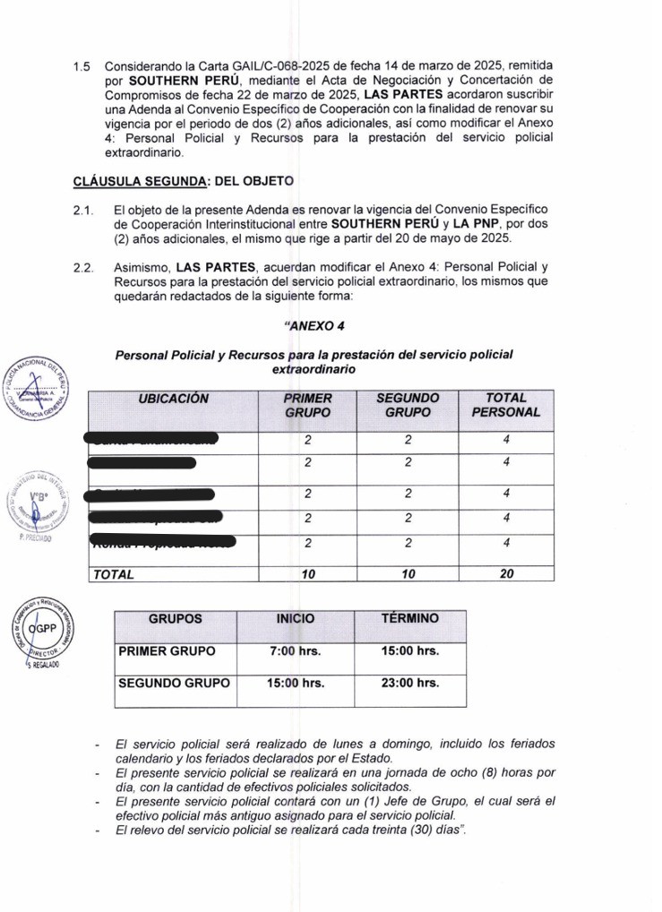 Los trámites de la renovación del servicio policial empezaron con la carta del 14 de marzo que Guillermo Fajardo Ccama, gerente de Asuntos Internos de Southern, envió a Zanabria Angulo con la intención de continuar recibiendo los servicios policiales. Un punto resaltante es que pidió incrementar los efectivos asignados de 15 a 20 “por encontrarse el proyecto en etapa de construcción”.
