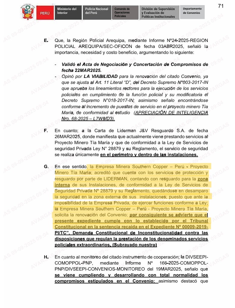 La Región Policial Arequipa contestó con el informe técnico N°24-2025. El documento concluyó que es “factible y viable” la propuesta de Southern. En el razonamiento institucional hay una “incidencia delictiva latente” en los distritos aledaños al terreno de la concesión “por actividad comercial y densidad poblacional”. Pero no incluyó información estadística para sustentarlo. Tampoco existe un análisis del conflicto social por la oposición de pobladores del valle de Tambo.