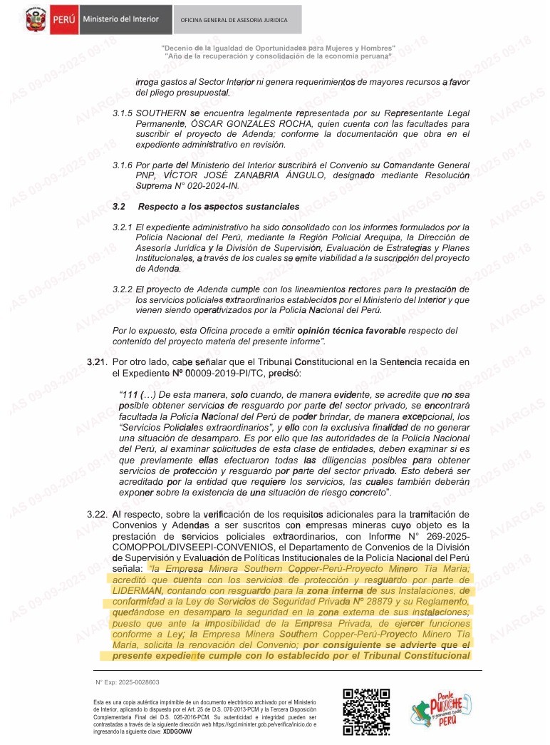 Antes de dejar la Comandancia General de la PNP, obligado por una decisión judicial de suspensión preventiva por posibles actos de corrupción, el general PNP Víctor Zanabria Angulo firmó la renovación del acuerdo con la transnacional. El 20 de mayo del 2025, el oficial colocó su rúbrica en el documento al lado de la de Óscar González Rocha, el directivo mayor de la minera en Perú.