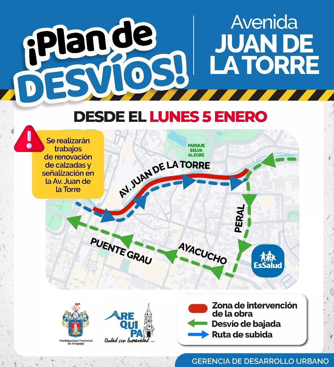 Para gestionar el movimiento vehicular, la subgerencia de transporte desplegará un grupo de 25 inspectores en los puntos de mayor afluencia. El personal podrá aumentar o rotar según las necesidades que surjan durante las primeras jornadas de cierre. Para quienes transiten por la avenida Juan de la Torre, la ruta de desvío principal utilizará la calle Peral y la calle Ayacucho. Los conductores que bajen desde Alto Selva Alegre deberán girar por Peral hasta alcanzar Ayacucho. Las autoridades enfatizaron que el tramo de la calle Peral comprendido entre Bouroncle y Ayacucho debe permanecer despejado de autos estacionados para evitar atascos. De igual manera, los técnicos sincronizarán los semáforos de la zona para generar una circulación continua, conocida como ola verde, especialmente en el eje de la calle Ayacucho y Jerusalén.