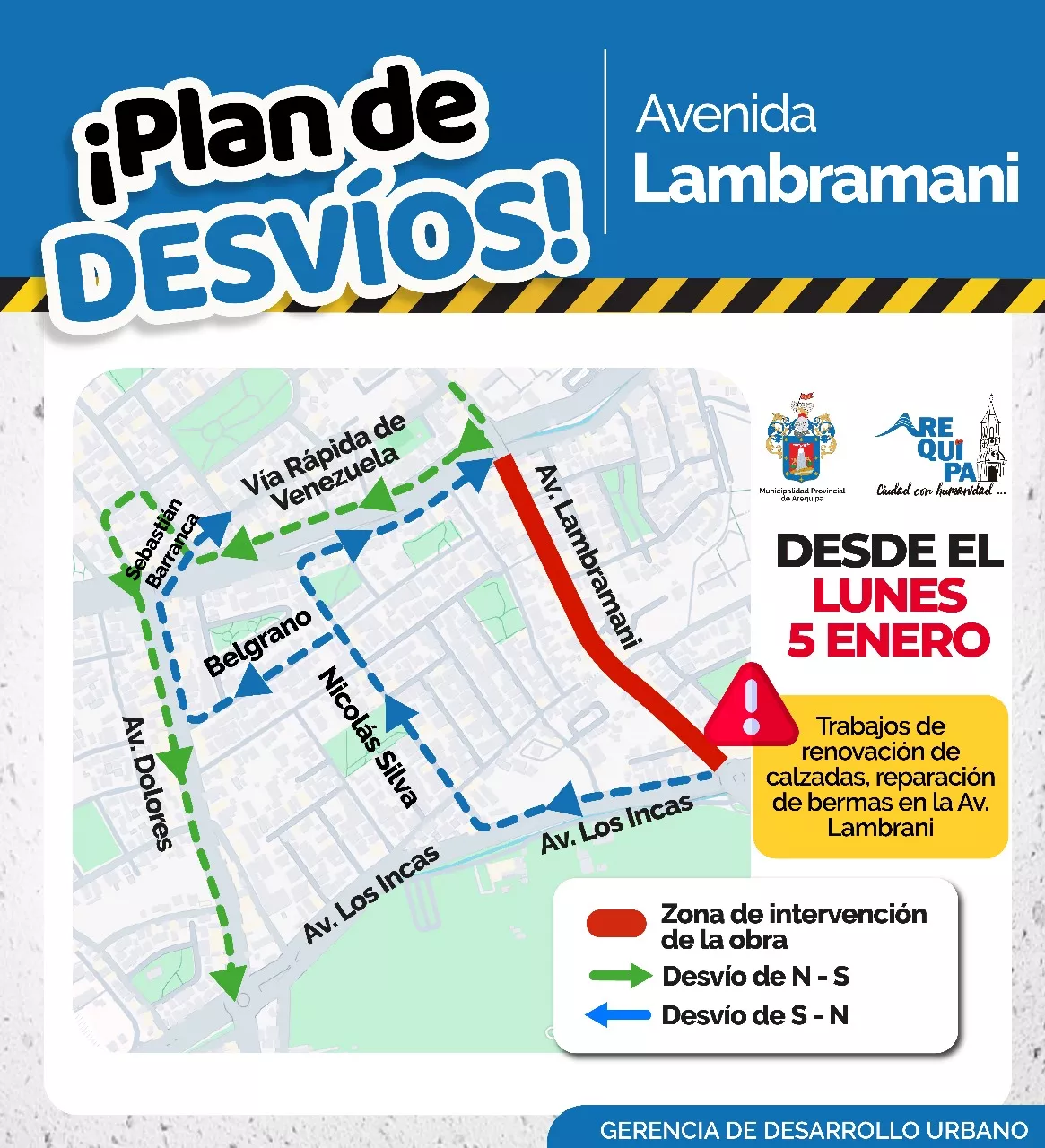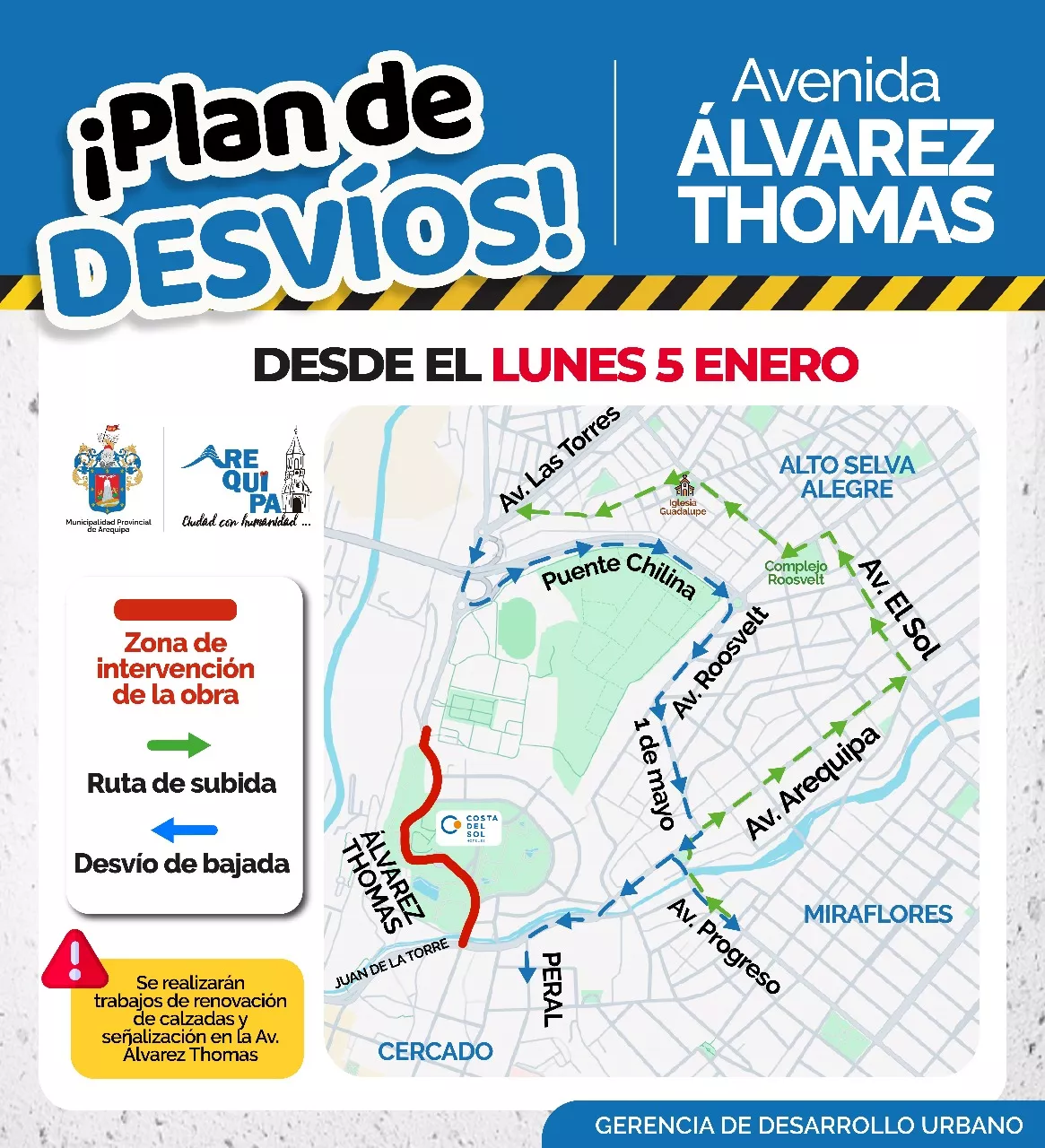 La Municipalidad Provincial de Arequipa programó el comienzo de los trabajos de mantenimiento en tres vías de alta circulación para el próximo 5 de enero. Las autoridades seleccionaron esta fecha porque la temporada de verano y la falta de labores escolares generan un menor movimiento de vehículos en la ciudad. El proyecto abarca específicamente las avenidas Juan de la TorreLambramani y Álvarez Thomas. En el caso de la avenida Juan de la Torre, el Consorcio Arequipa asumirá la ejecución con un presupuesto de 2,354,497 soles. El cronograma establece un plazo de 60 días para renovar más de once mil metros cuadrados de pavimento. Los encargados dividirán las labores en dos etapas: los primeros 30 días trabajarán en el carril de bajada y el tiempo restante lo dedicarán al carril de subida.