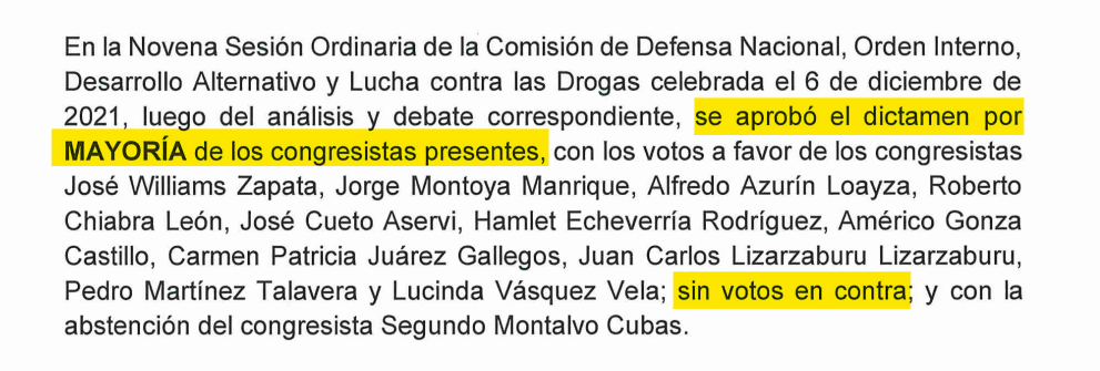 Ahora bien, contrario a lo expresado por Héctor Valer, quien señaló que fue “el único que votó en contra [de esta ley] en la Comisión de Defensa”, el registro de votos del dictamen en mención, adoptado en la novena sesión ordinaria de la Comisión de Defensa Nacional, Orden Interno, Desarrollo Alternativo y Lucha contra las Drogas, evidencia que el congresista no registró voto alguno.