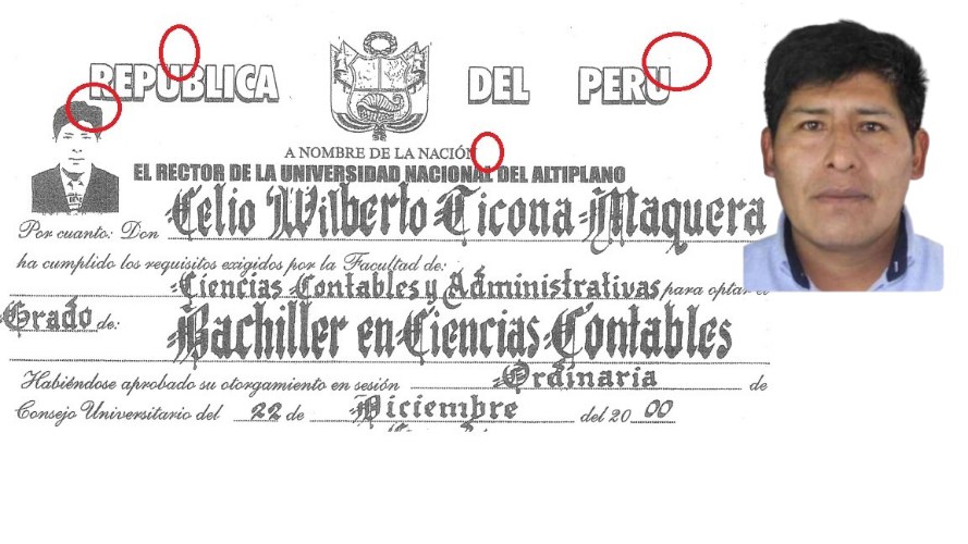 Lo más llamativo es el mismo grado de bachiller del aludido, pues dicho documento fue supuestamente expedido en el año 2000, cuando ya estaba vigente el registro obligatorio de títulos en la SUNEDU (desde el 2014). Es decir, no se puede comprobar que Celio Ticona sea un bachiller de verdad.