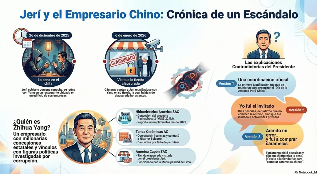 Como se sabe, la primera denuncia periodística de Cuarto Poder se produjo el domingo 11 de enero y revelaba la reunión en un chifa, el 26 de diciembre del 2025, con el ciudadano chino Zhihua Yang, a quien Jerí Oré llama Jhony.