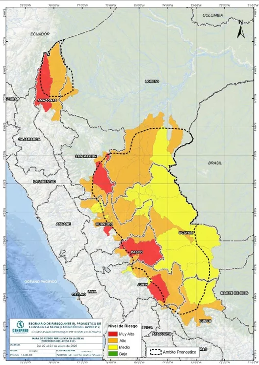 Así lo informó este organismo, conforme al escenario de riesgo elaborado por el Centro Nacional de Estimación, Prevención y Reducción del Riesgo de Desastres (CENEPRED), de acuerdo con el último aviso meteorológico dado este miércoles, en el que anuncian “la continuidad de precipitaciones de moderada a fuerte intensidad hasta el viernes 23 de enero”.