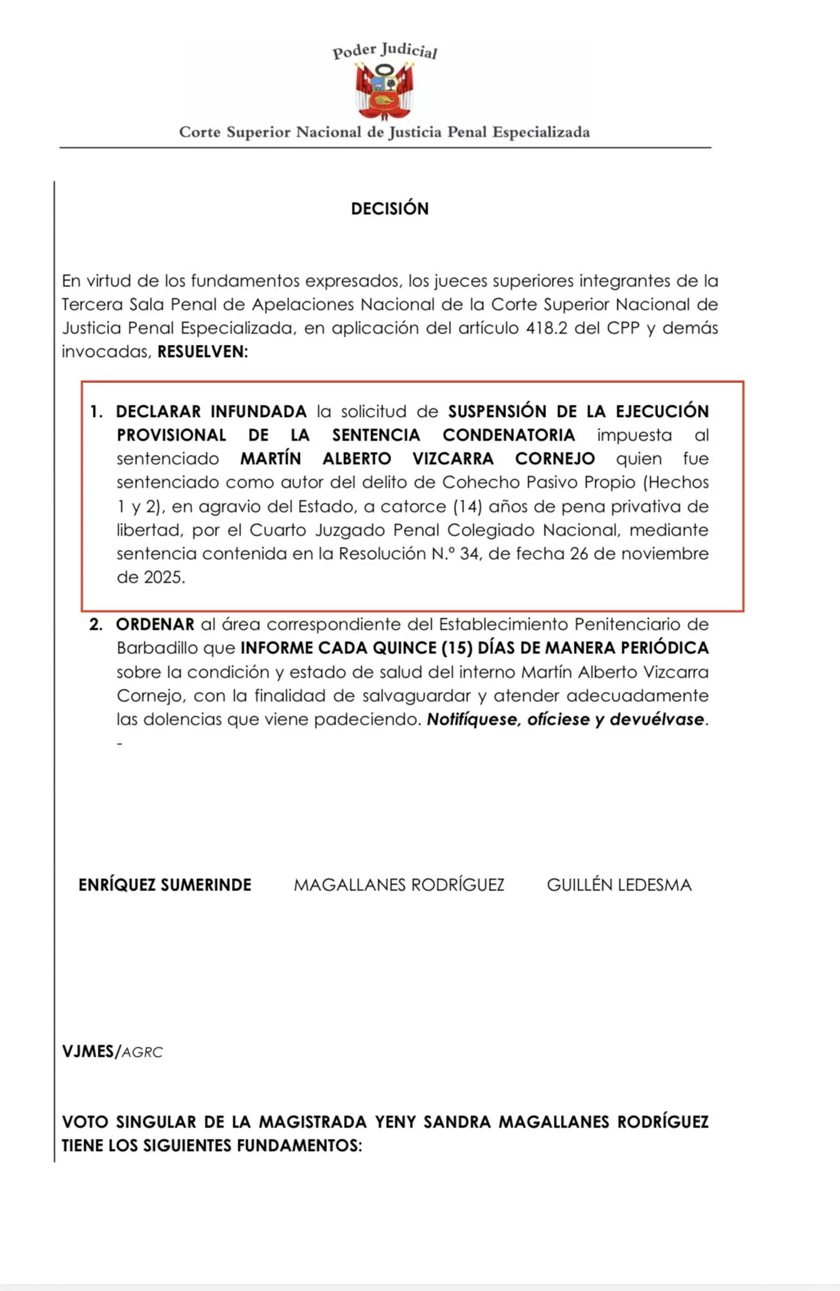 La resolución fue emitida el 26 de enero de 2026, por el colegiado integrado por los jueces Enríquez Sumerinde, Magallanes Rodríguez y Guillén Ledesma. Concluyeron que el pedido presentado por la defensa de Vizcarra Cornejo, carece de sustento jurídico, al haberse producido la caducidad de la medida restrictiva previa, lo que hace inviable la suspensión solicitada.