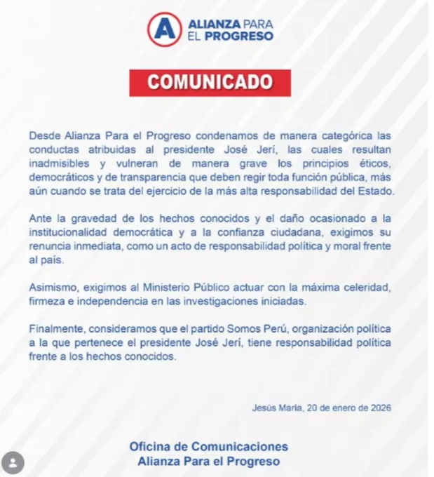 Además, APP basa el pedido de dimisión como un acto necesario de responsabilidad política y moral frente al país. “Para la organización, la gravedad de los hechos conocidos ha ocasionado un daño profundo a la institucionalidad democrática y ha afectado la confianza de la ciudadanía en sus autoridades”.