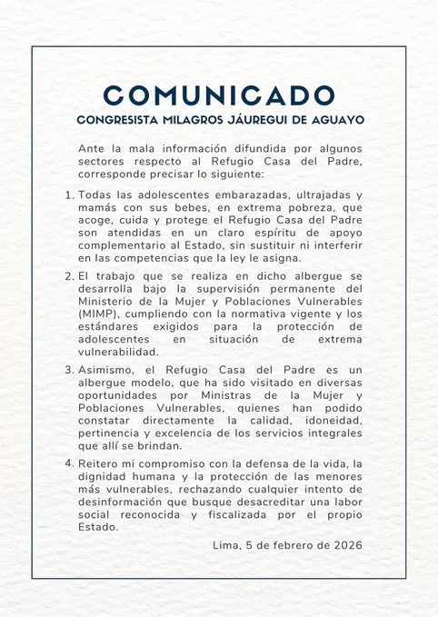 La congresista Milagros Jáuregui de Renovación Popular fue denunciada por la vía penal tras la difusión de imágenes en las que exhibe a menores cargando a los hijos que tuvieron, producto de una violación. Se le acusa de haber causado afectación psicológica a las niñas recluidas en el albergue de su propiedad “La Casa del Padre”.