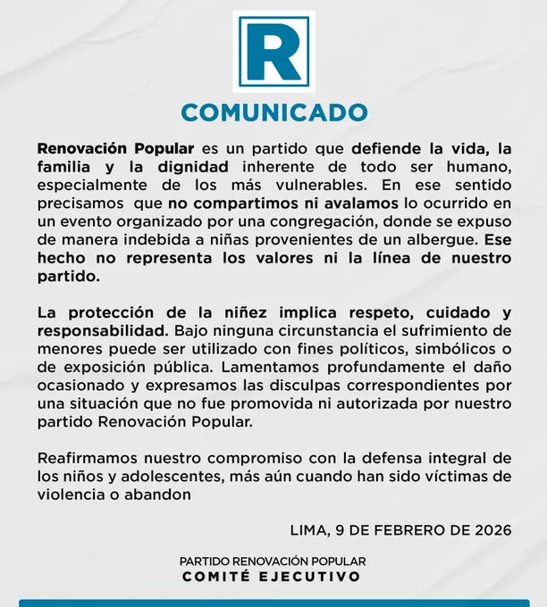 Rafael López-Aliaga ha salido a defender a su militante e incluso el partido Renovación Popular sacó un comunicado el mismo día en que se conocieron los hechos. Pero, solo para afirmar y repetir lo que dice Milagros Jáuregui que «defienden la vida». Que lamentan lo sucedido y que no comparten ni avalado lo ocurrido. Sin embargo, no se ha tomado ninguna decisión sobre la congresista que va a la reelección.