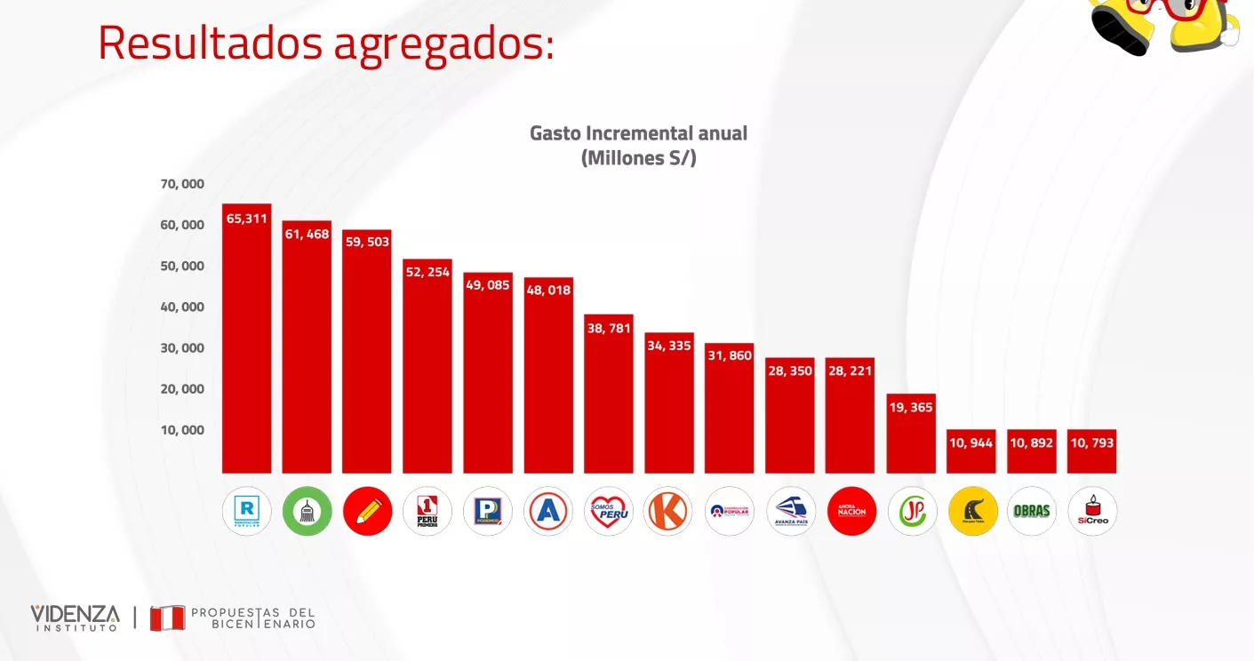 En el mismo estudio se detalla que hay partidos que van a las Elecciones 2026 ofreciendo en sus planes un menor costo incremental, que es el costo anual adicional a lo que actualmente se gasta. En este lado, están Sí Creo (S/10.800 millones), Obras (S/10.900 millones) y País para Todos (S/10.900 millones).