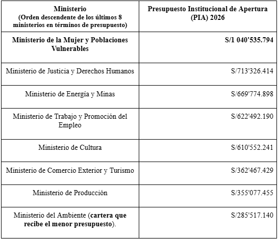 Ese monto equivale a la suma de los PIA recibidos en el 2026 por el Ministerio del Ambiente, el Ministerio de la Producción y el Ministerio de Comercio Exterior y Turismo.