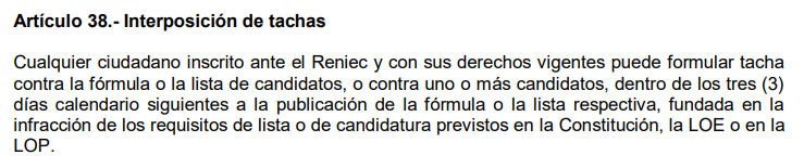 Sin embargo, las tachas que se presentaron en contra de su lista estuvieron dentro del plazo exigido por Reglamento de Inscripción de Fórmulas y Listas de Candidatos para las Elecciones Generales 2026: