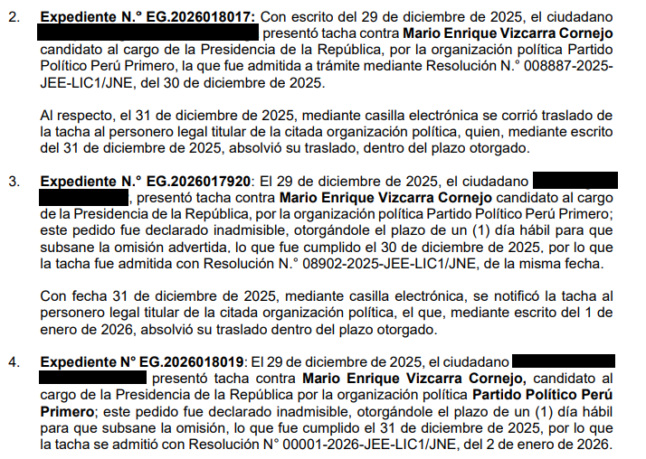 La admisión a trámite de la lista del partido político Perú Primero fue publicada el 26 de diciembre mediante la Resolución N.° 08797-2025-JEE-LC1/JNE. El 29 del mismo mes, y dentro del plazo establecido, se presentaron tres tachas en contra del candidato Mario Vizcarra: