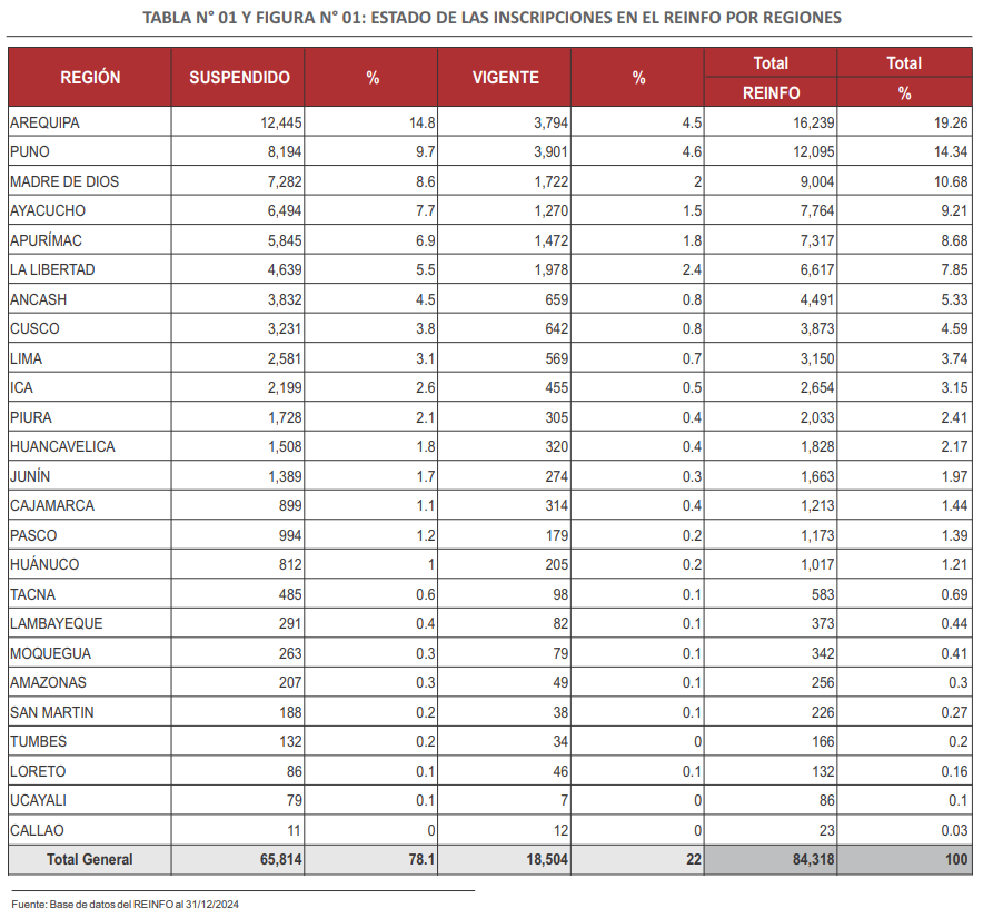 No obstante, según el anuario minero de 2024, hubo 84,318 inscripciones en el Reinfo, de las cuales 18,504 estaban vigentes y 65,814 suspendidas.