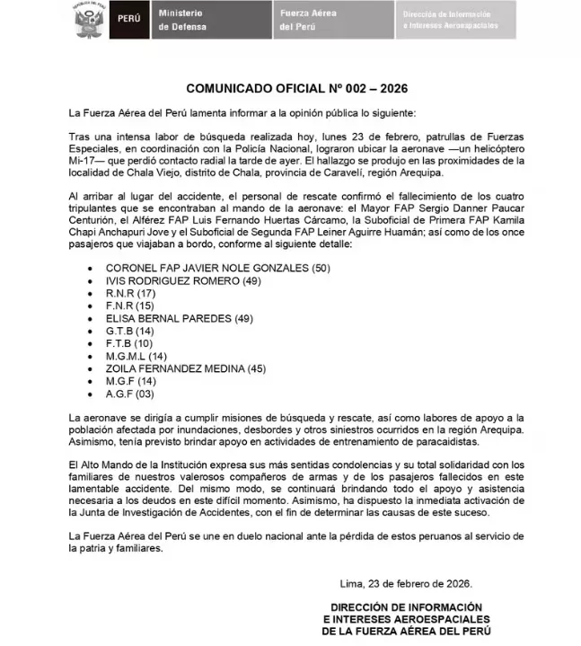 «Tras una intensa labor de búsqueda realizada hoy, lunes 23 de febrero, patrullas de Fuerzas Especiales, en coordinación con la Policía Nacional, lograron ubicar la aeronave —un helicóptero Mi-17— que perdió contacto radial la tarde de ayer. El hallazgo se produjo en las proximidades de la localidad de Chala Viejo, del distrito de Chala, provincia de Caravelí, región Arequipa», reza el comunicado.