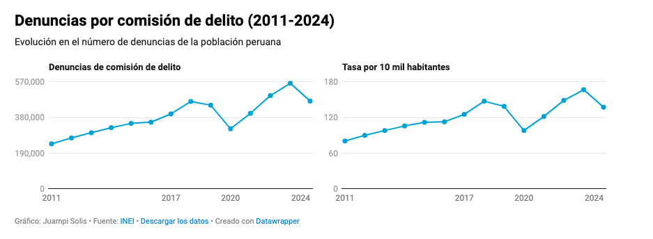 PerúCheck también revisó el consolidado de denuncias policiales 2011-2017 y 2018-2024. Halló el inicio de una tendencia al alza en las denuncias en 2017. Ese año se registraron 400,000 denuncias, 12% más que en 2016.