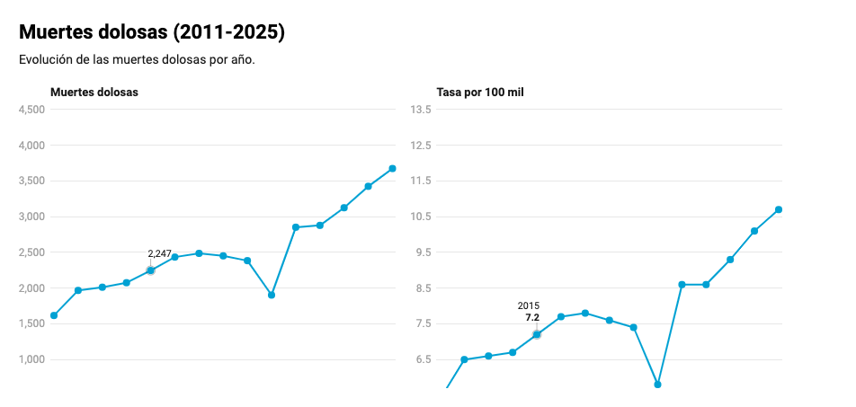 En realidad, la tendencia hacia el alza, que ocurrió de 2014 a 2015 y se mantuvo de 2015 a 2016, bajó en 2017. Esos años, la tasa de homicidios aumentó en 0.5; el 2017, en cambio, aumentó solo 0.1. A partir de allí, las cifras decrecen, hasta llegar a un fondo de 5.8 en 2020 (1,903 muertos), durante la pandemia del Covid-19.