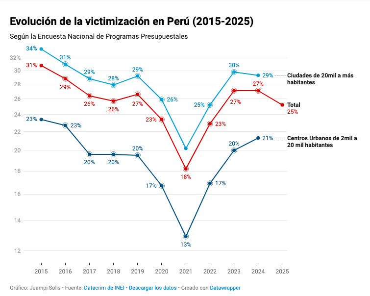 De acuerdo a los datos de la encuesta de victimización en el Perú, en 2017 el número de personas que reportaron haber sido blanco de algún delito bajó, no subió. Específicamente, 3 puntos porcentuales: pasó de 29% a 26%. Keiko Fujimori; sin embargo, dijo que ese año la criminalidad “explotó”.