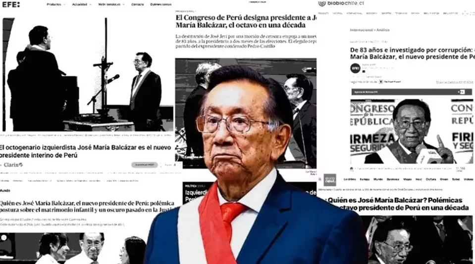 La designación de José María Balcázar como presidente interino del Perú tuvo inmediata repercusión en la prensa internacional. Su elección como titular de la Mesa Directiva del Congreso, con 64 votos frente a los 46 obtenidos por María del Carmen Alva, fue cubierta por medios de América, Europa y otras regiones que coincidieron en dos ejes: la crisis institucional peruana y el perfil polémico del nuevo mandatario.