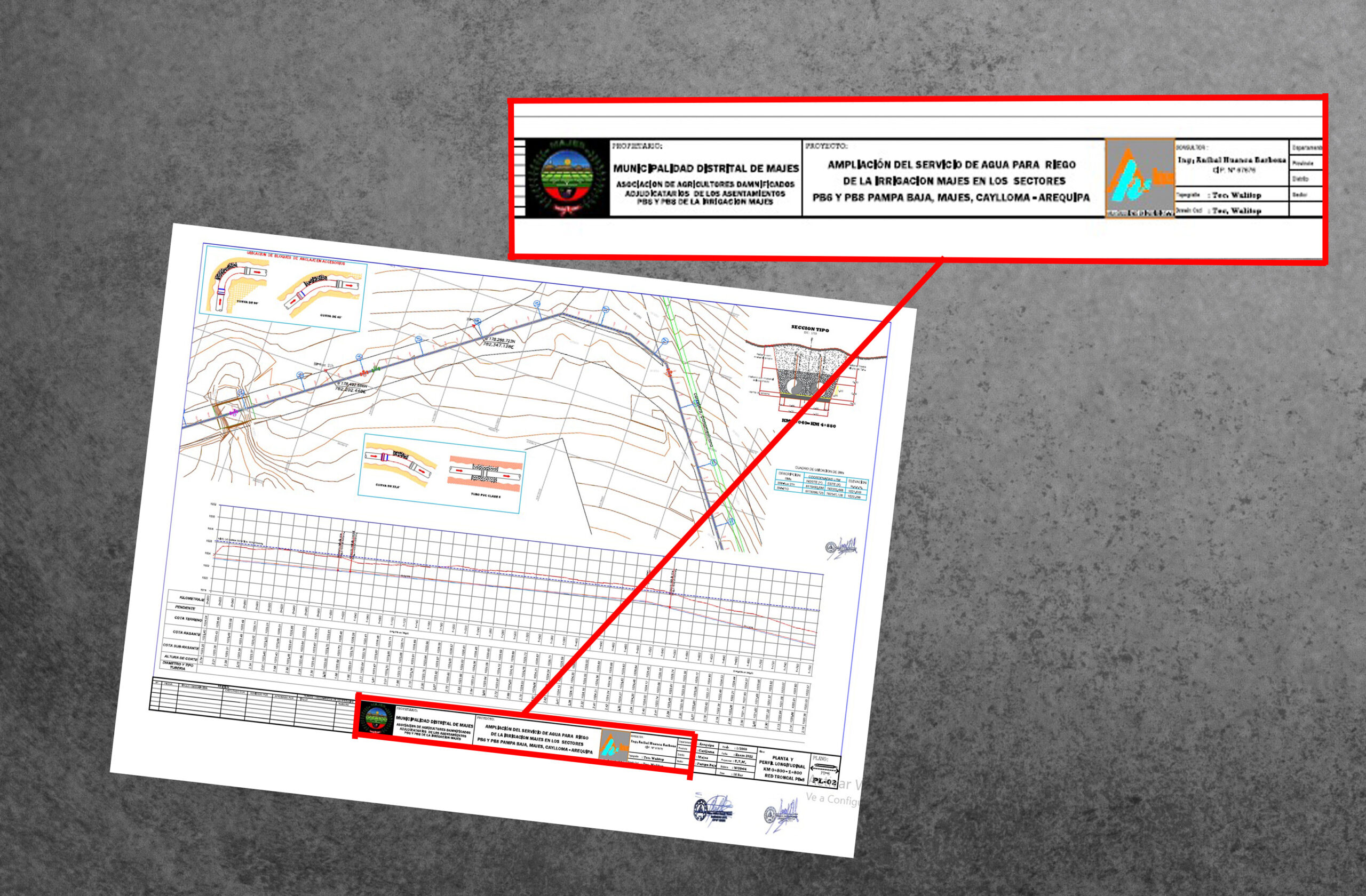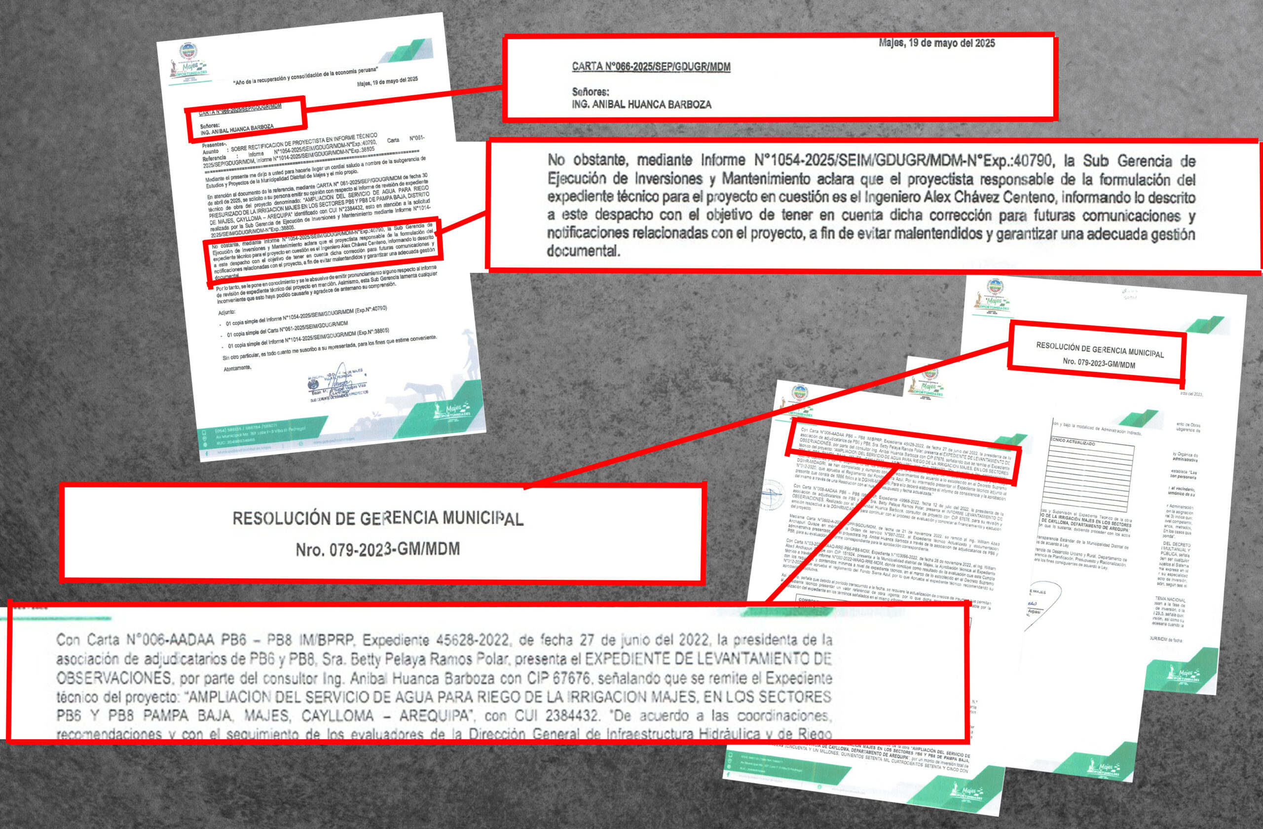 Sin embargo, la propia comuna se contradice y desbarataría lo dicho por Ramos. En la denuncia, el ingeniero presentó como prueba la resolución de gerencia municipal N°079-2023 que aprobó la actualización del expediente. El documento lo firmó Juan Nina Arpasi, gerente municipal de Huisa. La resolución detalla que Ramos Polar presenta el informe de levantamiento de objeciones elaborado por Huanca. Además, los planos del proyecto presentados, cuentan con el nombre del ingeniero y de su empresa.