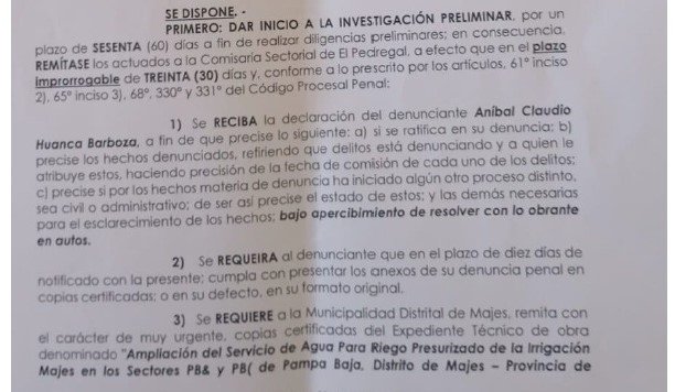 El expediente técnico del proyecto está bajo cuestionamiento. La Fiscalía Provincial Penal Corporativa de El Pedregal inició una investigación preliminar por los presuntos delitos de estafa, falsificación de documentos, falsedad ideológica y plagio. El ingeniero agrícola Aníbal Huanca Barboza, dueño de la empresa Ahua Soluciones en Ingeniería S.A.C., presentó la denuncia contra el alcalde Huisa Calapuja, una dirigente, tres ingenieros y dos funcionarios de la comuna de Majes.