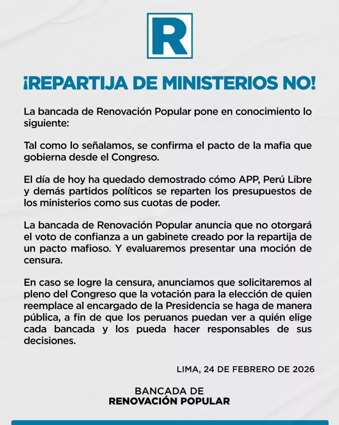 Asimismo, desde el partido Renovación Popular que se opuso a la continuidad de José Jerí, tras haber calificado al nuevo equipo ministerial como el resultado de un «pacto mafioso» y de una «repartija», han anunciado que sus 11 miembros votarán en contra. Es más, más allá de ir en contra la investidura, evalúan presentar una moción de censura contra el naciente gobierno de Balcázar.
